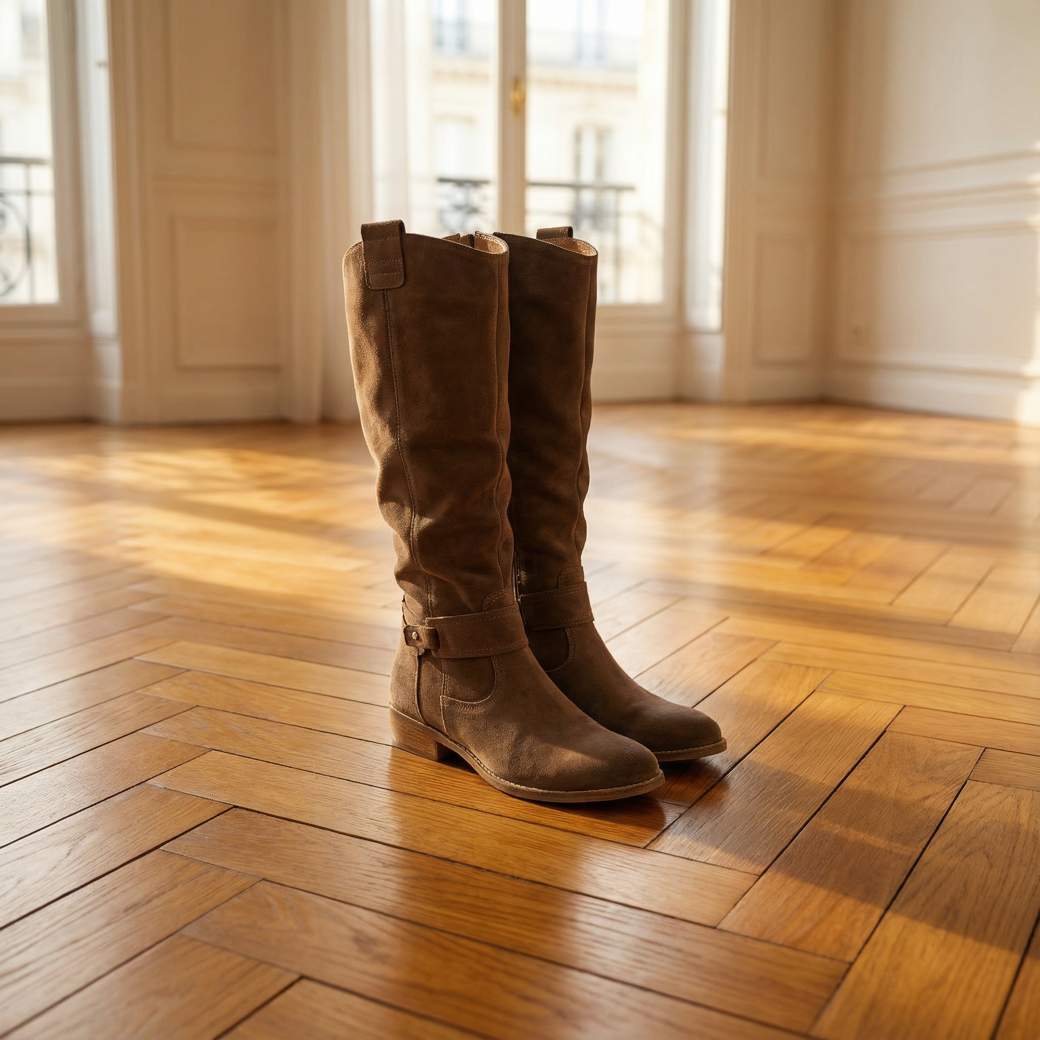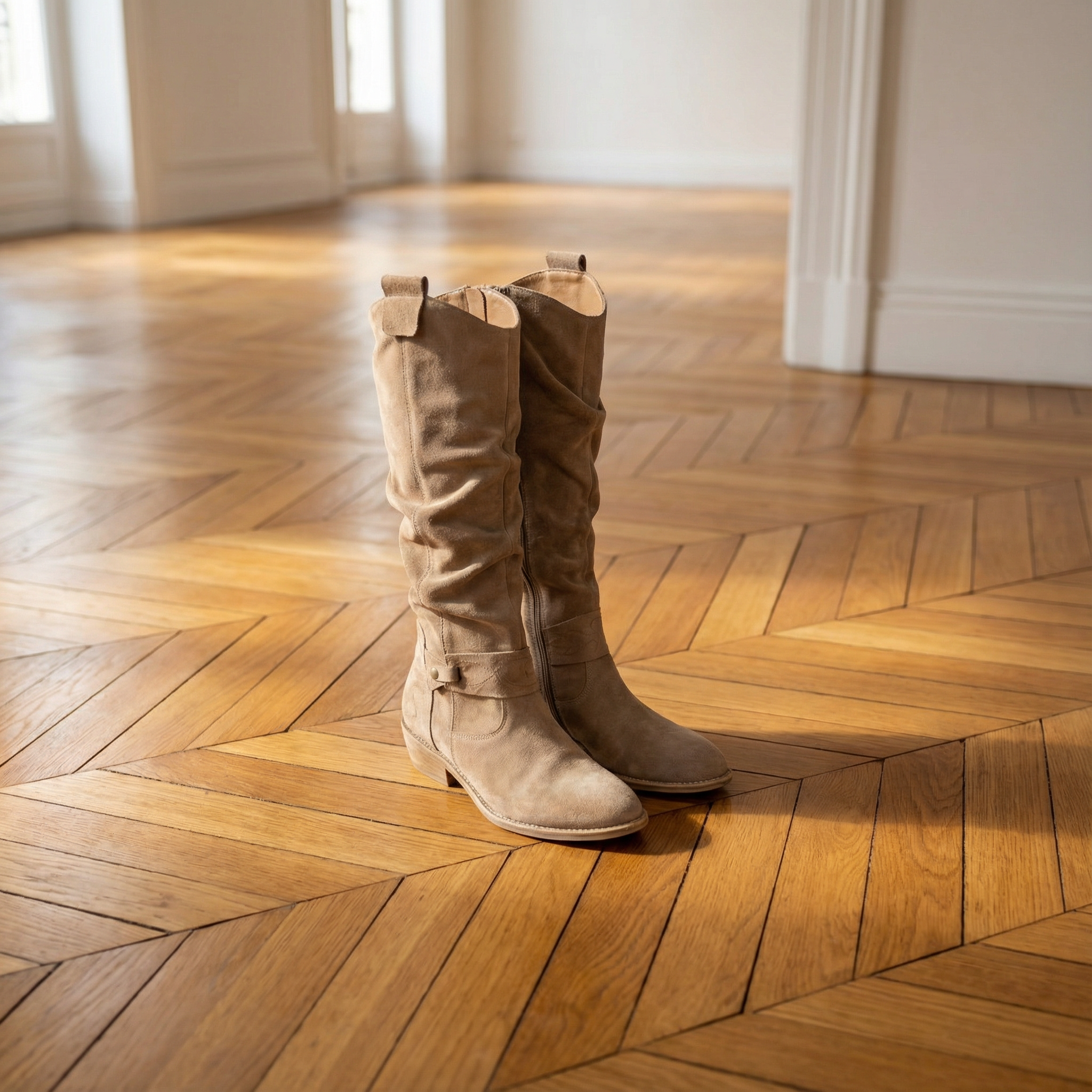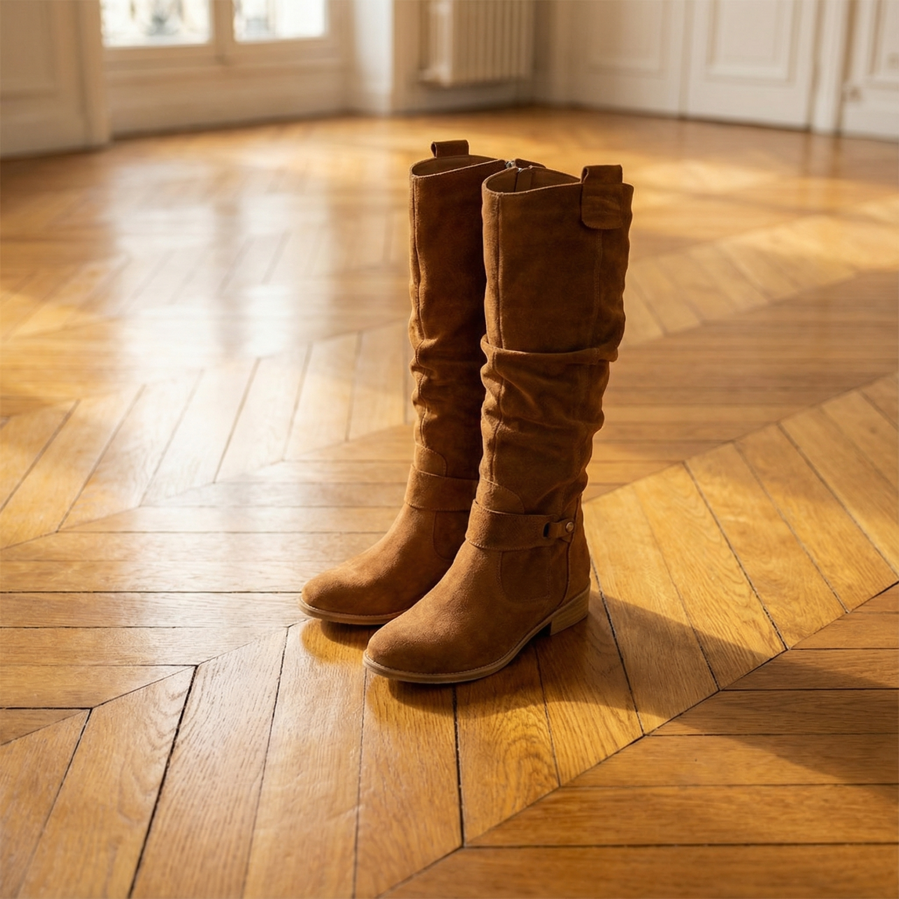 Women's knee-high boots with suede-style upper and slouched shaft. Features round toe, ankle strap with silver stud accent, pull tabs at top, contrast topstitching throughout, and low stacked block heel. Pull-on entry with rear zipper. Suitable for casual wear, everyday outfits, autumn and winter styling, or pairing with dresses, skirts, or jeans.