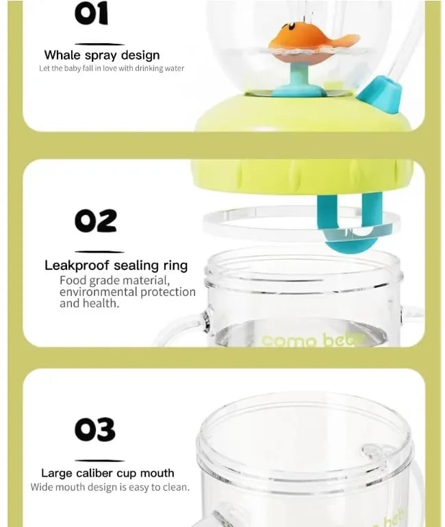 By utilizing air pressure the whale will spout when babies drinking, allowing babies to fall in love with drinking water in an entertaining way.