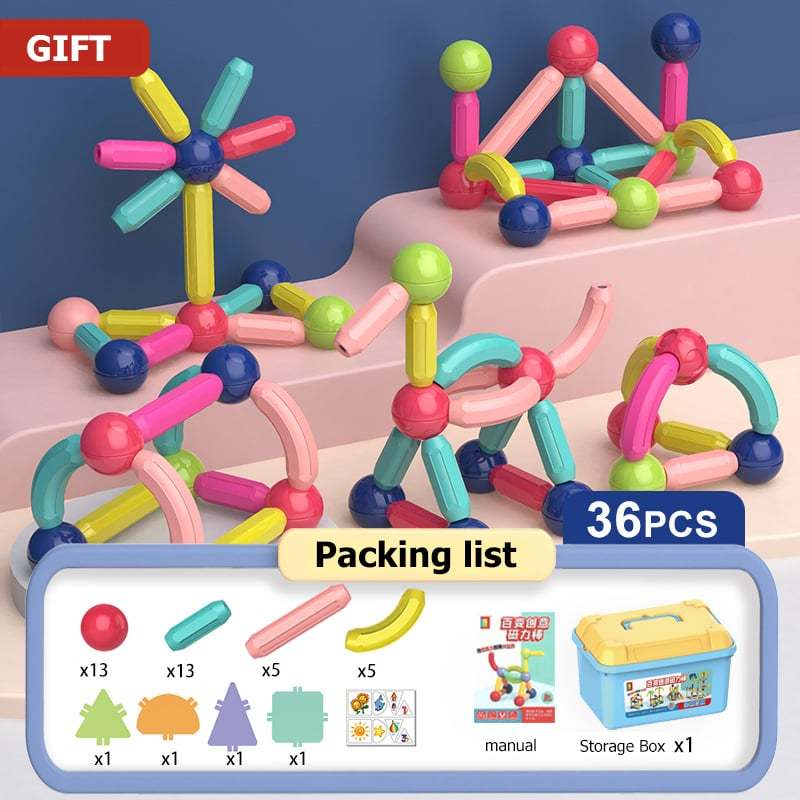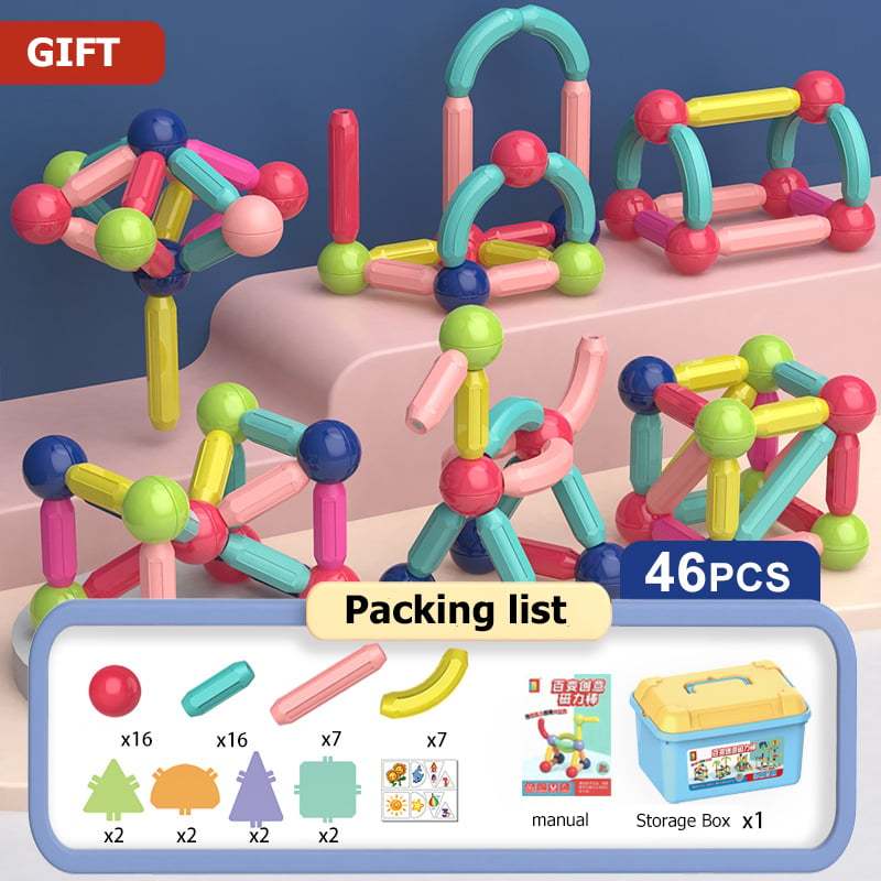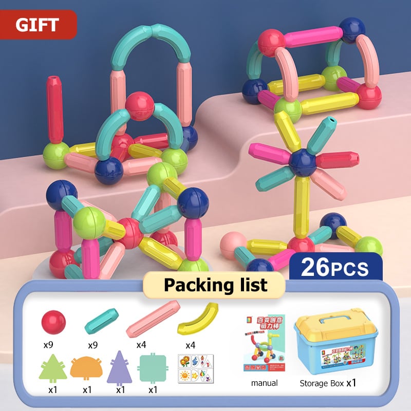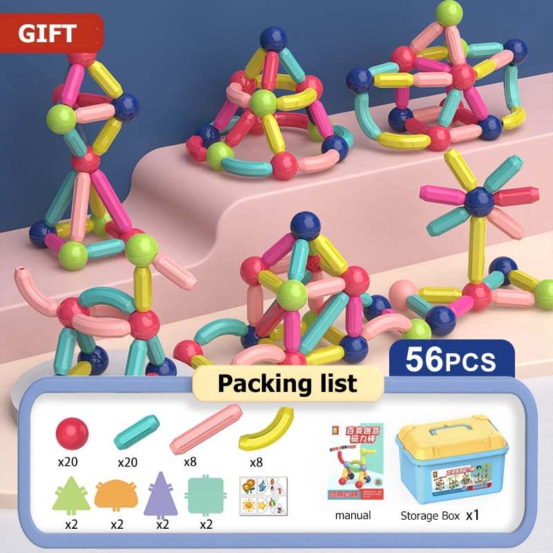 Educational Magnet Building Sticks & Balls Kit gives your children the experience they deserve – with 26/36/46/56 pieces in a variety of shapes, your child can choose between curved & straight shapes in different lengths, develop their creativity and plan intricate designs with our dazzling PASTEL COLORS, that ignite the imagination and give an artistic touch to every model, turning every day to a party with the balloon-like style of the magnets